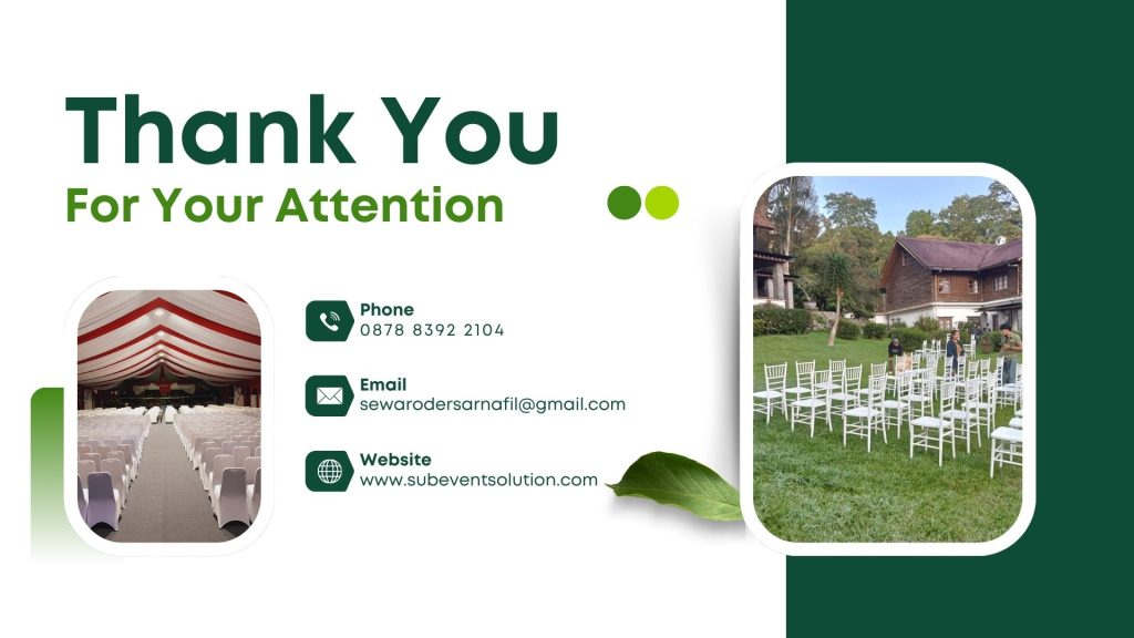 Dengan paket sewa ini, Anda tidak perlu repot mencari perlengkapan acara yang berbeda. Tim profesional sudah menyiapkan semua hal penting seperti tenda, kursi, dan pemasangan. Ini membuat acara Anda lebih lancar.