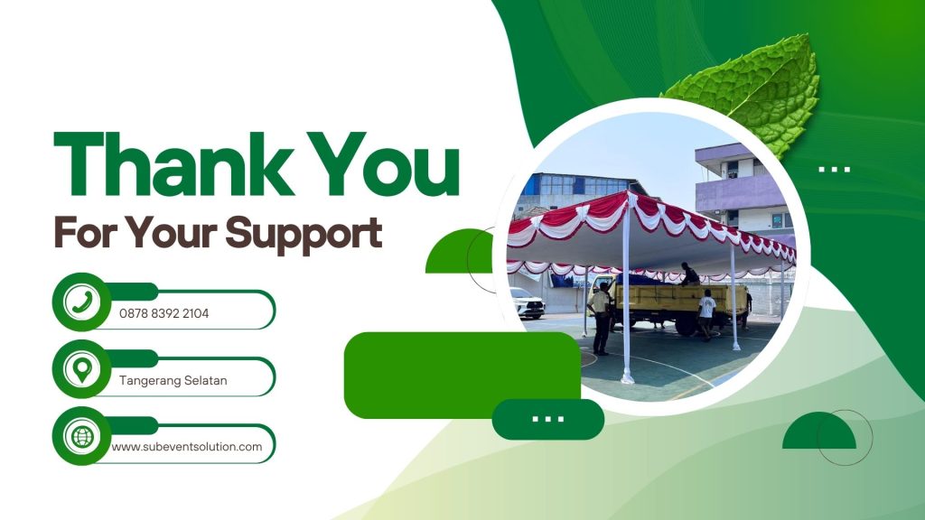 Keuntungan dari SUBEVENT: Tenda berkualitas tinggi dan bersih, tim yang profesional dan berpengalaman, pemasangan cepat dan rapi, dapat disesuaikan dengan konsep acara Anda, dan melayani wilayah Jakarta dan sekitarnya.